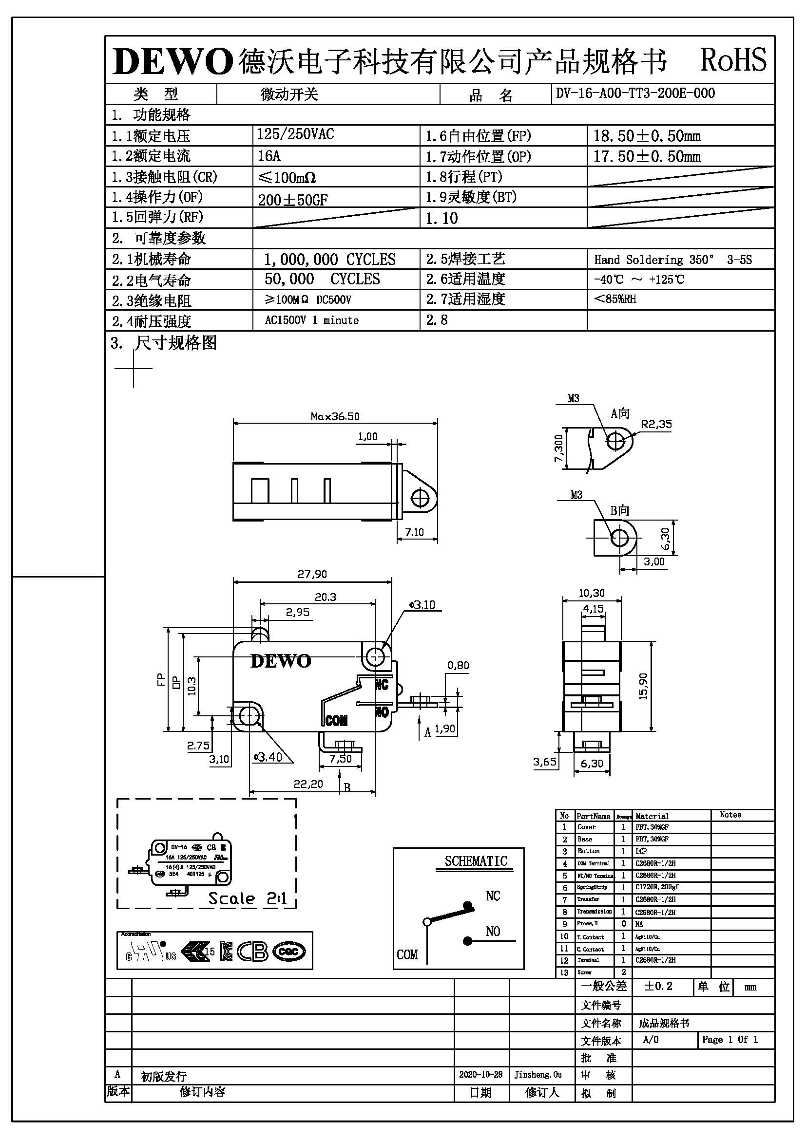 DV-16-A00-TT3-200E型微動開關